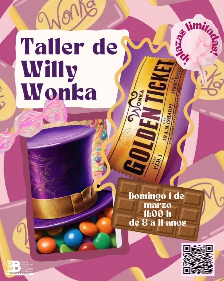 El próximo 1 de marzo a las 11:00 h, la Biblioteca Santa Ana se llenará de magia con un taller inspirado en Charlie y la Fábrica de Chocolate (Tim Burton), dirigido a niños y niñas de 8 a 11 años